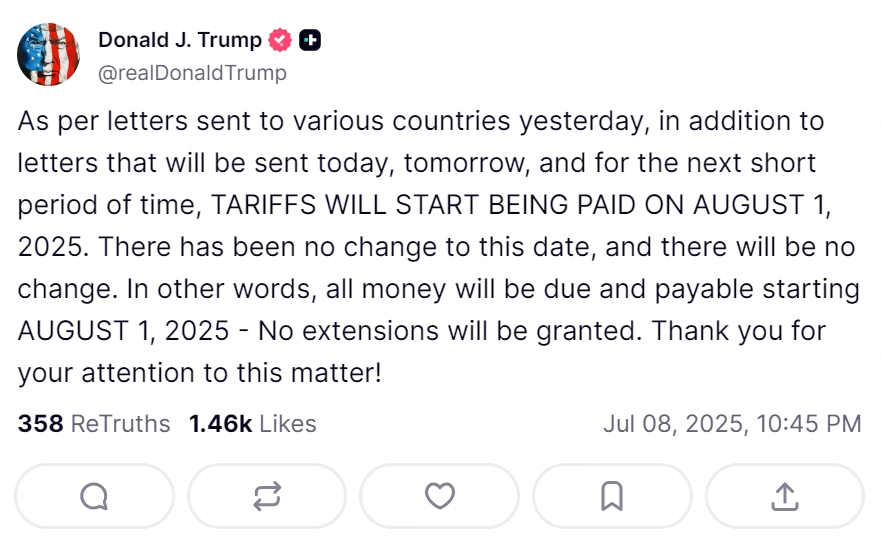 7月8日,美国总统特朗普在Truth Social上发帖称,根据昨日发给多国的信函,以及将在今天、明天和未来短期内陆续发出的其他信函,关税将于2025年8月1日起正式开始征收。这个日期没有任何更改,未来也不会有任何变动。换句话说,所有相关款项将自8月1日起到期应付,不给予任何延期。