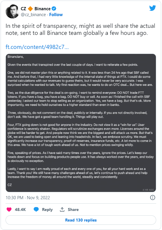 Zhao earlier on Wednesday tweeted a letter to staff that there was no "master plan" behind the deal and that "FTX going down is not good for anyone in the industry" and is not a win.