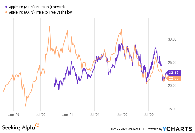Instead, I maintain my long-term stance that Apple is a great stock to have in the portfolio, especially if bought 18% below all-time highs. While valuations remain far from depressed (see chart below), I like the product portfolio that seems to support strong demand and the company's recent track record of executing well in virtually any macro environment.