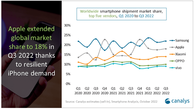Research company Canalyshas already previewed the story in the smartphone space in calendar Q3 (see chart below): "harsh business conditions" caused by "the gloomy economic outlook" and lingering supply chain constraints have resulted in a decline of nearly 10% in device shipments globally, which could have been worse if not for aggressive discounting. But Apple seems very much immune to these challenges. Canalys estimates that iPhone shipments increased in calendar Q3 instead, to the tune of almost 10%.