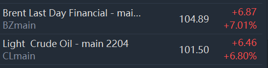 Brent crude rose 7% to $104.89 a barrel, WTI rose 6.8%.