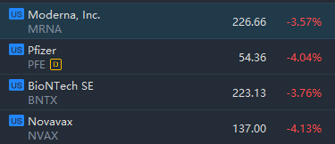 Some vaccine stocks slid in morning trading. BioNTech SE, Moderna, Pfizer and Novavax fell between 3% and 4%.