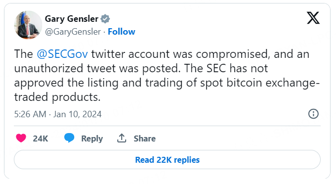 The US Securities and Exchange Commission said it had not yet granted approval of spot-Bitcoin exchange-traded funds, and that a post that appeared on the regulator’s official X account was untrue.