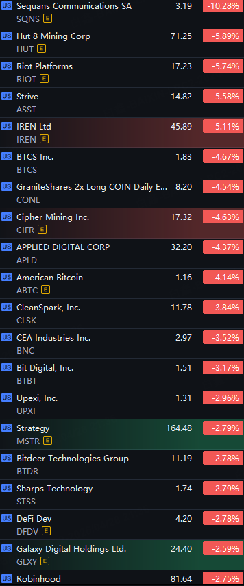 Crypto Shares Fall. SQNS Down 10%; Hut 8, Riot, Strive and IREN Down Over 5%; BTCS, APLD and ABTC Down Around 4%.