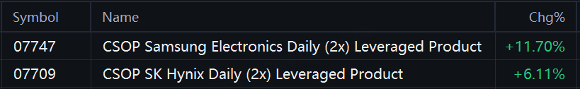 In Hong Kong, CSOP Samsung Electronics Daily (2x) Leveraged Product surged about 11%, while CSOP SK Hynix Daily (2x) Leveraged Product gained more than 6%.