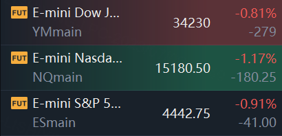 At 8:50 a.m. ET, Dow e-minis were down 279 points, or 0.81%, S&P 500 e-minis were down 41 points, or 0.91%, and Nasdaq 100 e-minis were down 180.25 points, or 1.17%.