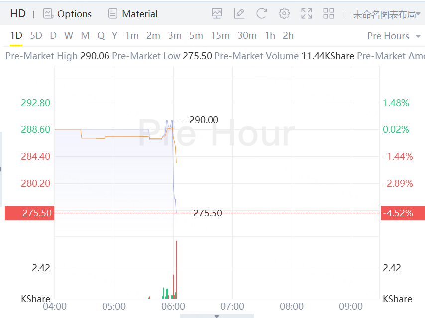 Shares of the largest U.S. home improvement chain tumbled nearly 5% in premarket trading after the company also missed first-quarter sales estimates, hurt by adverse weather and falling lumber prices.