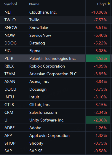 Cloudflare down 10%; Twilio down 8%; Snowflake down 7%; Figma, Palantir down 5%; Roblox down 4%; Unity down 2%.