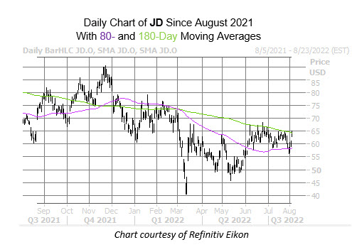 Specifically, JD stock just pulled back within one standard deviation of its 80-day moving average after a lengthy period trading above the trendline. According to a study from Schaeffer's Senior Quantitative Analyst Rocky White, five other similar instances occurred in the last three years. After 80% of these occurrences, JD enjoyed a positive one-month return, averaging a 4.7% jump. A similar move from its current perch would put the security just above the $66 level, marking a breakout above the aforementioned 180-day moving average.