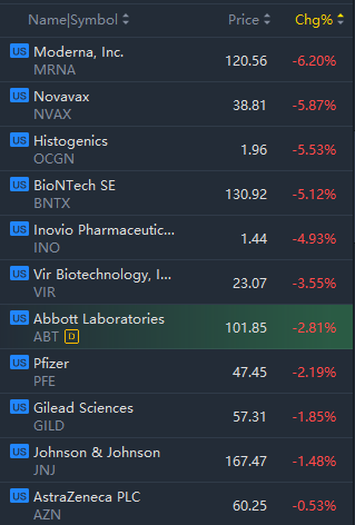 Vaccine stocks declined in morning trading, with Moderna and Novavax falling around 6%.
