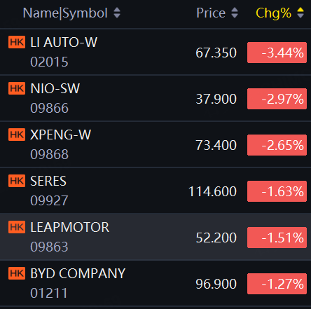 EV shares slid in Hong Kong. Li Auto, NIO down around 3%; XPeng down over 2%; Seres, Leap Motor, BYD Company down over 1%.