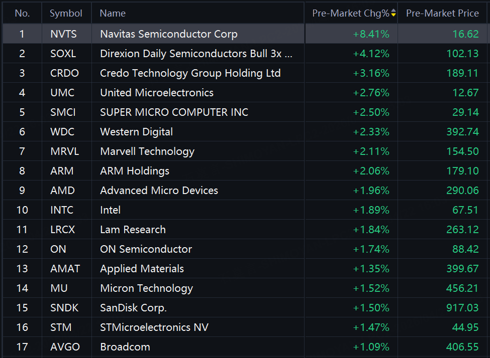 Chip and storage stocks rallied in premarket trading. Navitas jumped another 8%; SOXL up 4%; Credo, Western Digital, Marvell, Intel up around 2%.