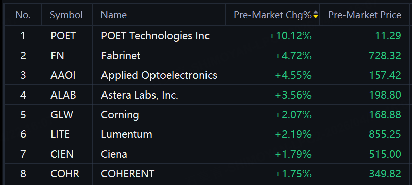 Optical Communication Stocks Jump. POET Technologies up 10%; Fabrinet, Applied Optoelectronics up over 5%; Astera Labs up over 3%.