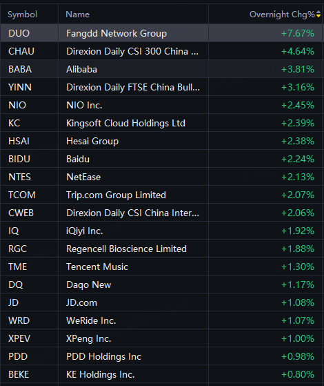 Fangdd rose 8%; Alibaba rose 4%; YINN rose 3%; Nio, Baidu rose 2%; PDD rose 1%.