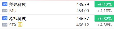 Sandisk涨近23%,AI推动存储需求爆棚,公司2026财年第二财季利润和营收大幅增长,不仅超出华尔街预期,也显著高于公司此前给出的指引。受此消息影响,存储概念股跟涨。美光科技、希捷科技均涨超4%。