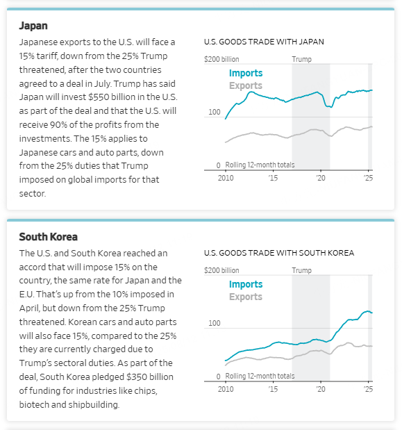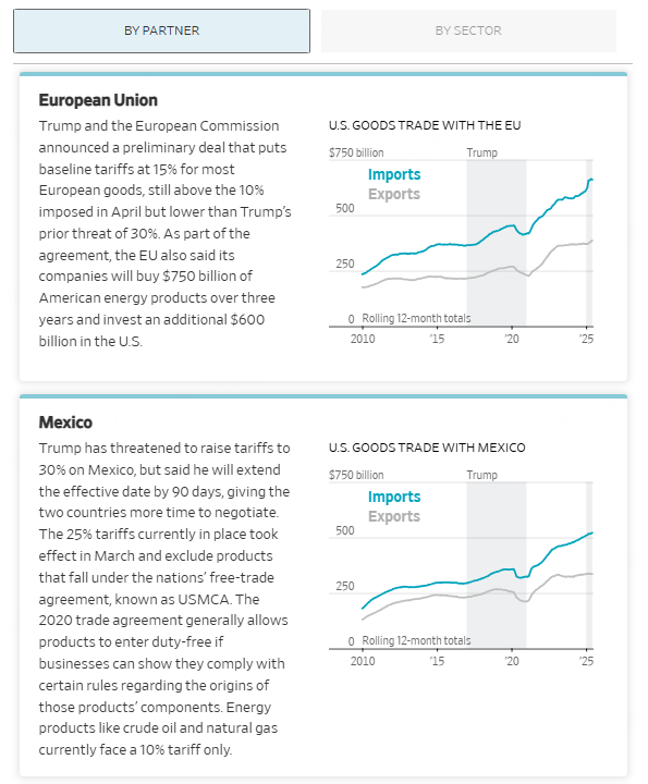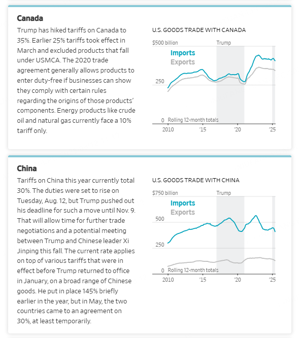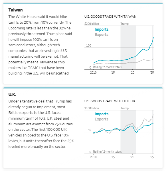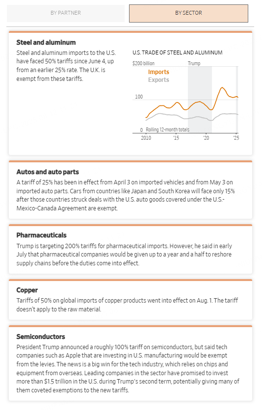 Below is a roundup of where tariffs stand for major countries and sectors: