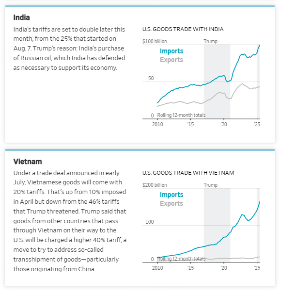 India not only hasn’t yet struck a deal but landed in Trump’s crosshairs for buying Russian oil. It is set to face 50% tariffs later this month, up from 25% currently.