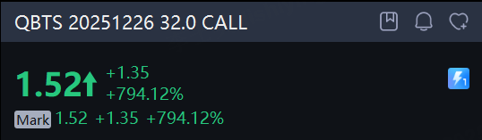 There are 184.09K D-Wave Quantum option contracts traded on Monday, up 217% from the previous trading day. Call options account for 69% of overall option trades. Particularly high volume was seen for the $32 strike call option expiring December 26, with 6,064 contracts trading. QBTS 20251226 32.0 CALL