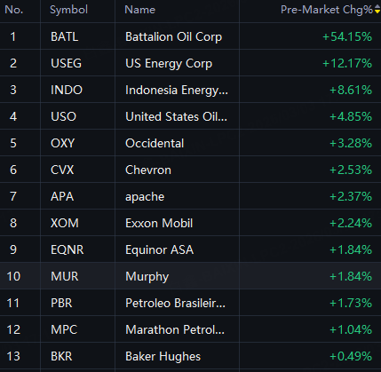 Oil Stocks Jump as Brent and WTI crude jump 5%. Battalion Oil up 54%; US Energy up 12%; Indonesia Energy up 9%; USO up 5%; Occidental up 3%; Chevron, apache and Exxon Mobil up 2%.