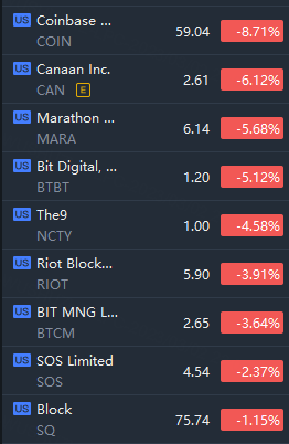 Crypto stocks remained red in morning trading; Coinbase Global, Inc. slumped nearly 9% while Canaan Inc. slid over 6%.