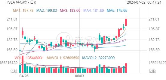尽管即将公布的消息,特斯拉的股价在过去两周内上涨了约18%。截至周一收盘,该股收涨6.05%,报209.89美元,这是2024年1月19日以来的最高水平,且为连续第五个交易日上涨。