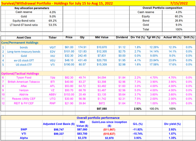 For these above considerations, we hold VTI as a core holding in our accounts. We always hold two separate accounts in a barbell model, one forshort-term survivaland the other for long-termaggressive growth. The links here are for our free blog articles where we update our detailed holdings and performance tracking periodically. Take the survival portfolio as an example, the following chart shows our holdings for the incoming month. As you can see, we maintain a relatively simple portfolio with a few core ETFs (and VTI is our core holding for U.S. exposure) and a few tactical holdings.