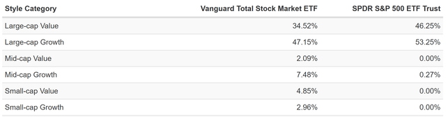 Now, the key difference is in the rest of the 19% in VTI. As you can see, they are invested in mid-cap and small-cap. As seen, VTI holds about 10% of mid-cap stocks (9.5% to be more precise). The split in the mid-cap space is heavily skewed toward growth with 2.09% mid-cap value and 7.48% mid-cap growth. the remainder 9% is vested in small caps primarily (about 7.8%) and other categories (such as emerging markets and Global ex-US Developed Markets). The split in the small-cap space is heavily skewed toward value (4.85%) and growth is only at 2.96%.