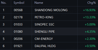 HK Oil & Gas equipment and services stocks shined. Shandong Molong up 17%; Petro-King up 13%; Sinopec SSC up 5%; Shengli Pipe up 4%.
