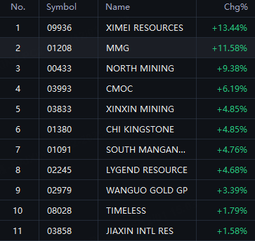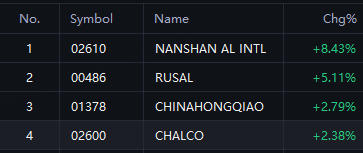 HK diversified metals & mining stocks and aluminum stocks shined. Ximei Resources up 13%; MMG up 12%; North Mining up 9%; Nanshan Al up 8%; CMOC up 6%; Rusal up 5%; ChinaHongqiao and Chalco up 2%.