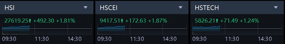 The Hang Seng Index (HSI) rose by 1.81% to 27,619.25, the highest level since July 2021; the Hang Seng China Enterprises Index (HSCEI) increased by 1.87%, the Hang Seng Tech Index (HSTECH) gained 1.24%.