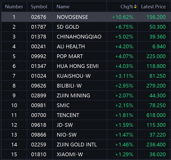 NovoSense surged over 10%; SD Gold up 6.8%; China Hongqiao up 5%; Ali Health, Pop Mart up 4%; Kuaishou, Bilibili up 3%.