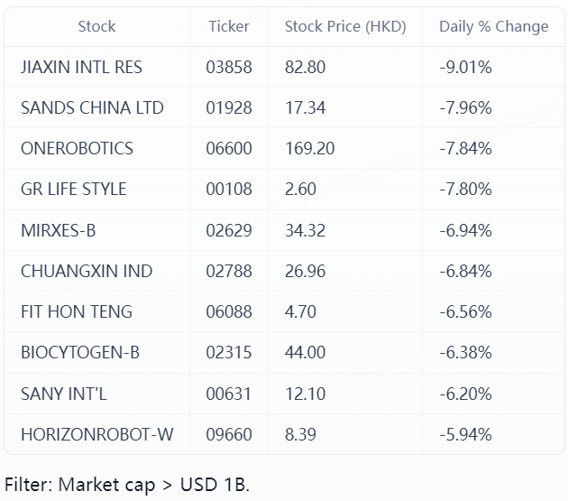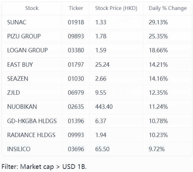 Property developers surged after reports that regulators no longer require monthly “Three Red Lines” updates for many firms, aiding sentiment: SUNAC +29.13%, LOGAN GROUP +18.66%, and SEAZEN +14.16% led gains, while consumer staples outperformed with Distillers & Vintners +11.94%. Commodities-linked groups were buoyant: media noted oil & gas producers rallied as crude extended gains; gold-related stocks rose as spot gold hit an intraday high, supporting miners. Conversely, gaming was weak: SANDS CHINA -7.96% fell after Macao EBITDA disappointed, pressuring the Casinos & Gaming -4.75% sector.