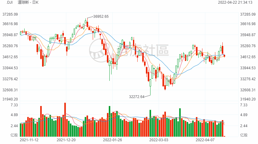 4月22日(周五),道琼斯指数开盘下跌220.44点,跌幅0.63%,报34572.32点;标普500指数开盘下跌14.01点,跌幅0.32%,报4379.65点;纳斯达克综合指数开盘上涨10.80点,涨幅0.08%,报13185.46点。消息面上,美国国债收益率延续涨势,投资者继续权衡美联储主席杰罗姆鲍威尔的鹰派言论。