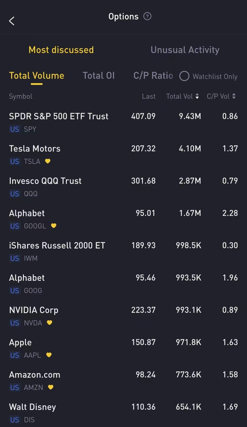 Top 10: SPY, TSLA, QQQ, GOOGL, IWM, GOOG, NVDA, AAPL, AMZN, DIS