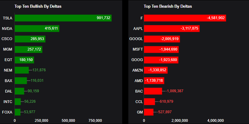 Top 10 bullish stocks: TSLA, NVDA, CSCO, MGM, EQT, NEM, BAX, DAL, INTC, FOXA