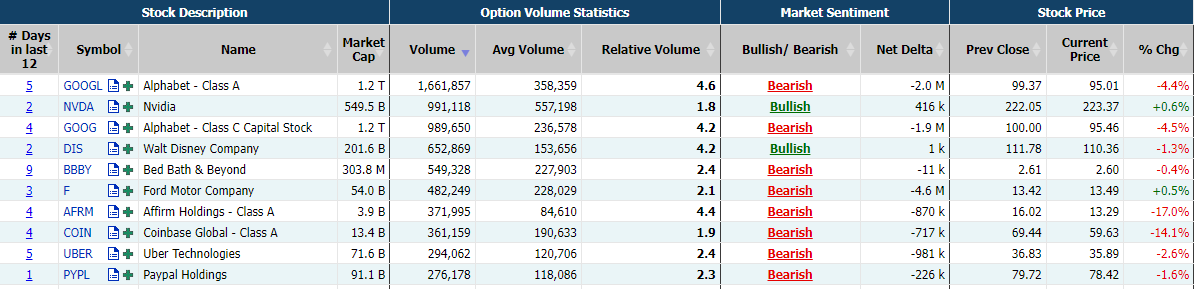 This report shows stocks with the highest volume of bullish and bearish activity by option delta volume, which converts option volume to an equivalent stock volume (bought or sold).