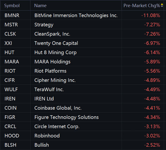 Crypto stocks sank in premarket trading as bitcoin briefly dropped below $75K. BitMine fell 11%; Strategy and CleanSpark fell 7%; MARA Holdings and Riot Platforms fell 6%; Cipher Mining and IREN fell 5%; Coinbase fell 4%; Circle and Robinhood fell 3%.
