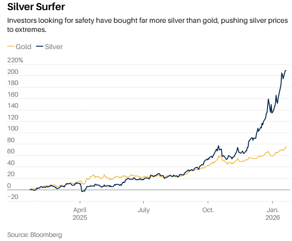 Now around $98 an ounce, silver isn’t just beating nearly every other commodity—it’s also cruising past gold, its bigger brother in the safety trade. Gold is up 74% over the past year, a respectable gain but far behind silver’s parabolic rise.