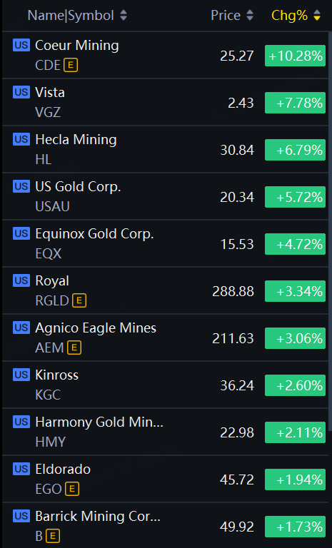 Coeur Mining up over 10%; Vista up 7.8%; Helca Mining up 6.8%; US Gold up 5.7%.