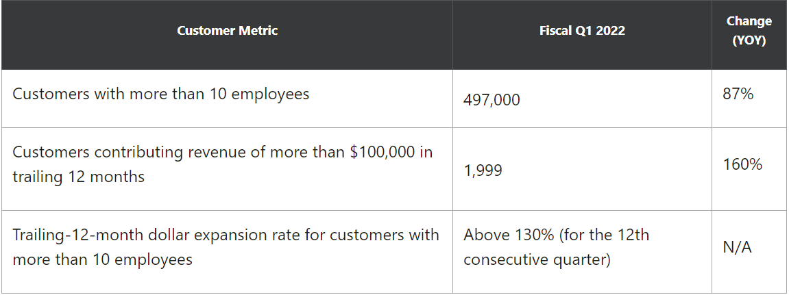 For context, last quarter, the number of customers with more than 10 employees skyrocketed 470% year over year to 467,000, and the number of customers contributing more than $100,000 in trailing-12-month revenue jumped 156% to 1,644.