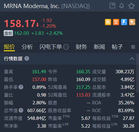 截至发稿,Moderna盘前涨幅超2%。