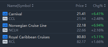 Cruise Line Stocks Gained in Premarket Trading. Royal Caribbean, Carnival, and Norwegian Cruise climbed between 1% to 2%.