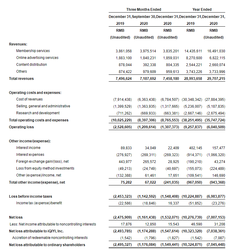爱奇艺应占净亏损为15亿元(2.372亿美元),而归属于爱奇艺的净亏损为25亿元2019年同期。归属于爱奇艺的每股美国存托凭证摊薄净亏损为人民币2.10(新台币$ 0.32元)相比2020年第四季度归属于爱奇艺的美国存托凭证摊薄净亏损人民币3.43在2019年同期