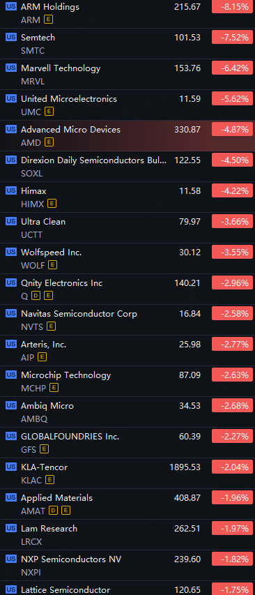Chip stocks dropped. ARM and Semtech fell 8%; Marvell and UMC fell 6%; AMD fell 5%; SOXL and Himax down 4%.