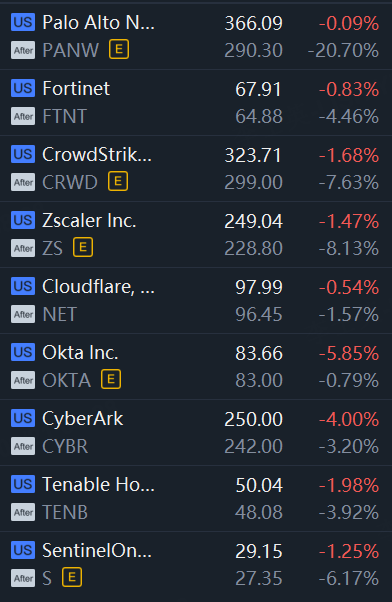 Other cybersecurity stocks also dropped in extended trading. Zscaler and CrowdStrike fell 8%; SentinelOne fell 6%; Fortinet and Tenable fell 4%; CyberArk fell 3%.