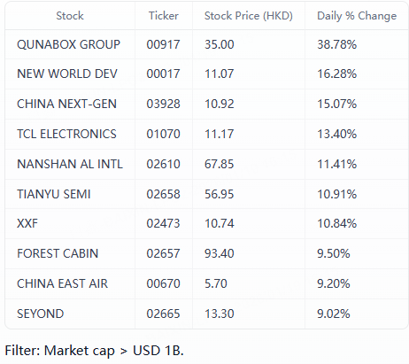 Outside tech, several notable movers and sector themes stood out. Consumer electronics led the board, with the sector up +10.53%, aligning with strong single-stock performances such as TCL Electronics (+13.40%). Airlines rallied as well, with China Eastern Airlines (+9.20%) featuring among top gainers; intraday reports also noted strength in Hong Kong-listed carriers, including China Southern and Air China. Communications equipment names were bid up intraday, with coverage highlighting gains in fiber and connectors. In property, New World Development (+16.28%) surged, reflecting stock-specific catalysts and value rotation into developers.