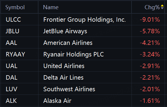 Carnival and Norwegian Cruise Line were down 7.6% and 10.5%, respectively, while Royal Caribbean fell 3.3%. United Airlines slipped 2.9% and Delta Air Lines fell 2.2%