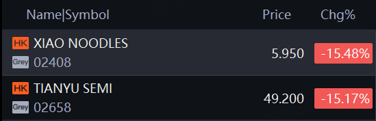Tianyu Semi fell 15.48% in grey market trading while Chinese noodle restaurant operator Xiao Noodles fell 15.17%.