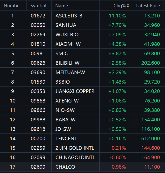 Ascletis up 11%; Sanhua, Wuxi Bio up over 7%; Xiaomi, SMIC up about 4%; Bilibili, Meituan up over 2%.