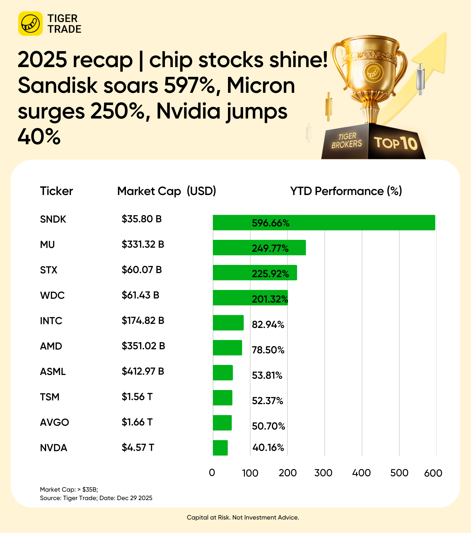 Among major chip companies, SanDisk Corp emerged as the standout performer, with its shares rising nearly 600% year-to-date, according to data from Tiger Trade. Despite a relatively modest market capitalization of about $35.8 billion, the stock benefited from a powerful turnaround in the NAND flash market, where tighter supply and improving pricing sharply lifted earnings expectations.